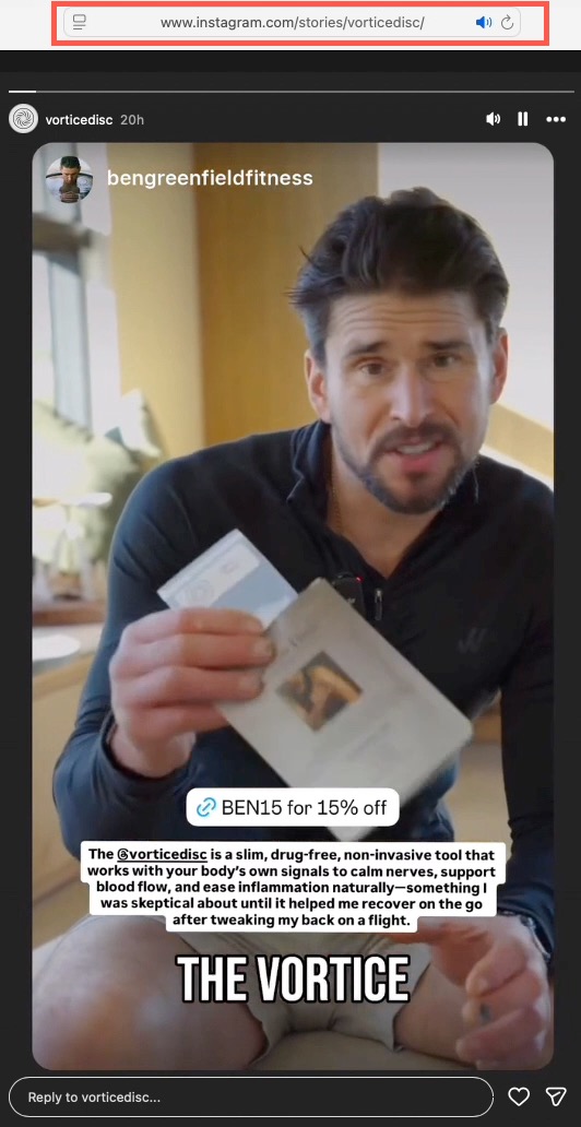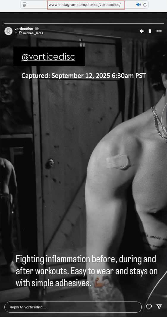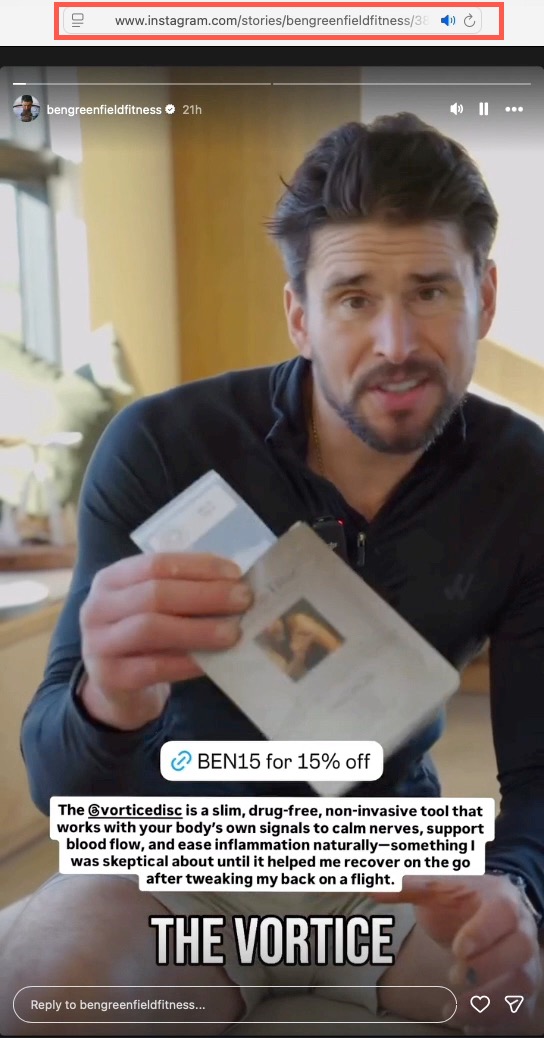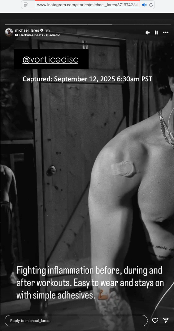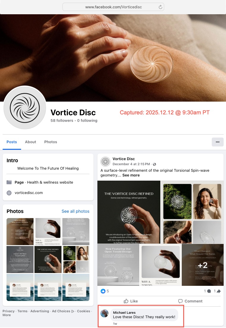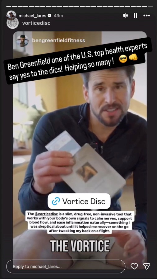 Here is a gallery of screen captures of Michael's social medial postings promoting the Vortice Disc (from May 19, 2025 to date). The company responsible for the plastic discs is Spinfield Technologies Inc., incorporated by Arthur B. Flick. In a podcast interview with Ben Greenfield Michael (March 23, 2016) Michael spoke of his decades–long relationship with Flick. In the interview Michael and Greenfield collaboratively promoted a device marketed by Michael and Flick (the SomniResonance SR1 Delta Sleeper) with Greenfield offered an affiliate-type 10% discount code ("Greenfit10"). In a later podcast interview with Greg Zuffelato (Feb 22, 2017), Michael again ties the SR1 pitch to his long-standing relationship with Flick, while describing himself as an “angel investor” and board member. He layers regulatory-sounding reassurance that may be read as implying FDA endorsement, but the interview does not provide evidence of FDA approval, supporting documents, or third-party verification. He leans on authoritative medical and technical language (e.g., “brain” sleep frequencies, “nudging” sleep stages, “resetting” circadian rhythm, and gauss comparisons) while advancing broad efficacy and safety claims, including medication-adjacent “step-off” comments, without the interview providing supporting evidence, references, or independent validation a reader can check. He offers a 5% discount to those who email him at Delta Sleeper. Around the same period a November 24, 2016 WHOOP feature likewise describes Lares as proprietor of an “FDA–approved” sleep aid and summarizes SR1 as using pulsing electromagnetic signals to help induce sleep, again utilizing regulatory-sounding language presented without supporting documentation or independent verification in the article.