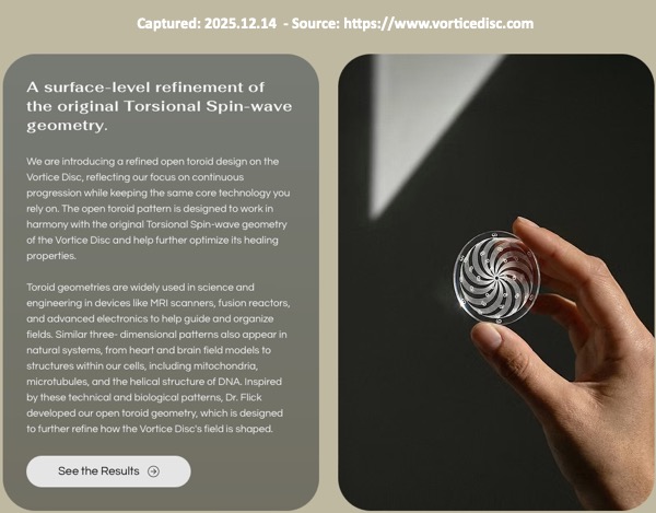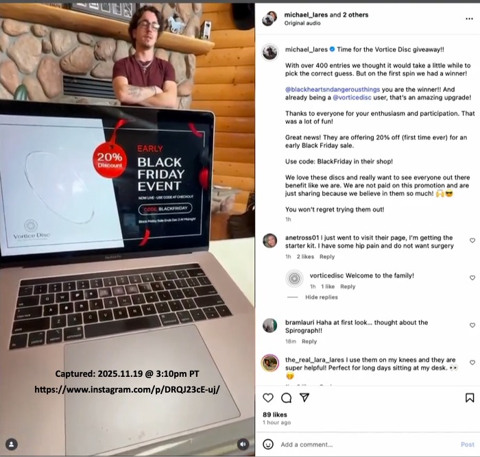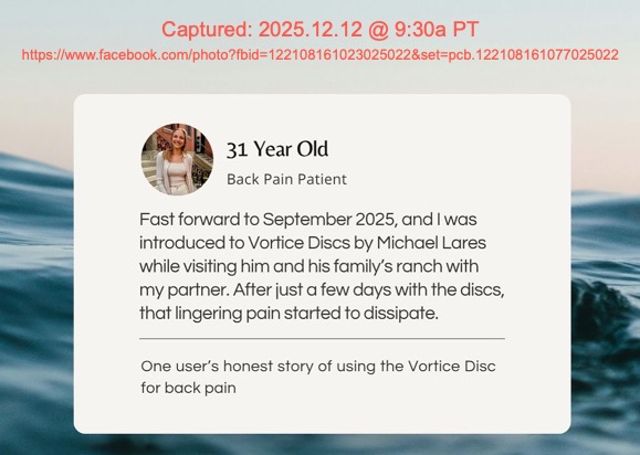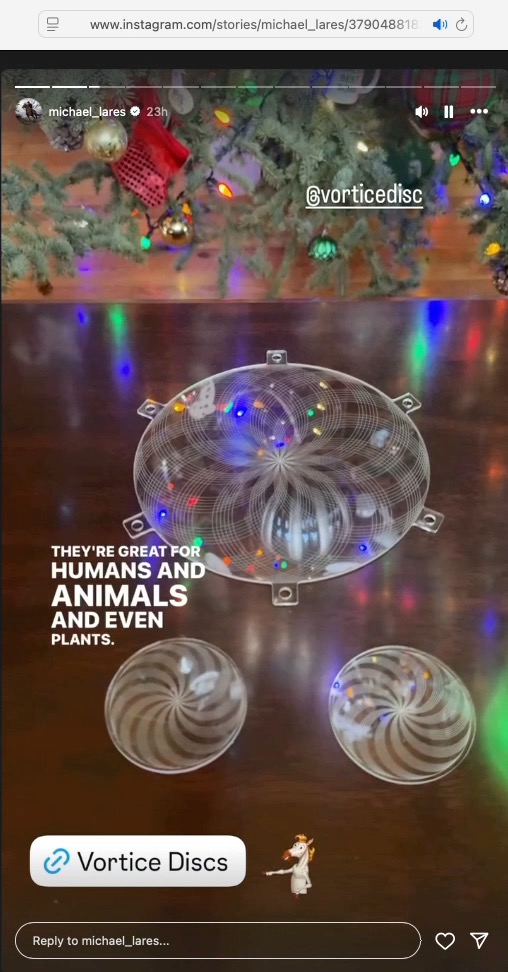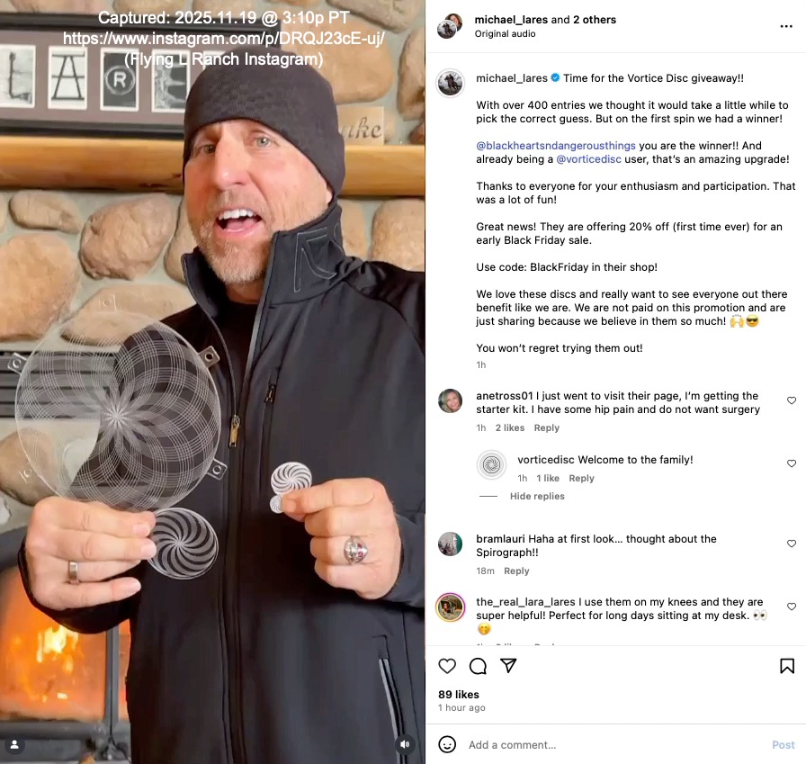 Who is Ben Greenfield? Michael's says he's "one of the U.S. top health experts" but we cannot find anything to verify that statement. Greenfield identifies himself as the "World's Top Biohacker", and appears to have over 870K social media followers/subscribers But Greenfield has also been subject to criticism for promoting devices and treatments in product categories that independent experts/regulators often say lack solid evidence and may be dangerous. Greenfield recommends things like coffee enemas, injecting an experimental peptide clearly labeled "not for human use" (Met Enkephalin), and "doing daily rectal ozone insufflation for myself and my family" (meaning: blowing ozone gas up the anus). Ben Greenfield’s site is a cesspool of pseudoscience. He promotes anti-vaccine propaganda, his nutrition ideas are not supported by robust science, his podcast guests are quacks, his advice to cancer patients dangerous, and his biohacking experiments are often ridiculous. » Indication Michael handles Vortice Disc technology and commercial pathway? During a chat session on November 20, 2025, the Vortice Disc website’s AI Chat Support disclosed additional details about Michael’s relationship with Flick and their respective involvement with the Vortice Disc: They've known each other for decades — Dr. A. B. Flick's work spans over 40 years and his collaboration with SpinField Technologies (associated with Michael Lares) grew out of that long history of development and clinical work. Within hours of that session, the Vortice Disc AI Chat Support was disabled. When it returned three days later, inquiries about Michael Lares or related matters were met with prompts directing users to email "manager@vorticedisc.com". Our research indicates this is consistent with the use of the Wix AI Site Chat which allows site operators to curate its data sources and direct what may be presented: Inject your own business knowledge into the AI Site Chat to enhance its performance. The more knowledge rules you add in the dashboard, the more accurate its responses will be. » Examples of health claims: The promoters, including Michael, make fantastic claims that the product will bestow all sorts of healing and health benefits to "anyone seeking safe, natural pain relief and healing". Specific examples of the kind of dramatic health claims being made for a product that is explicitly disclaimed as ‘not a medical device’ and ‘not intended to diagnose, treat, or cure any specific medical condition’ include: Michael claims, among other fantastic things these plastic discs can do, is that they have reversed the age of the 14 year old family dog: We have truly reversed his age with the @vorticedisc but his ear mites we just can't get ahead on so he's going to @dragon_lake_vet_hospital to see Dr. Ginger and get that dealt with and a full check up! Our 14 year old ranch pup Frisky! He looks happy! (September 3, 2025 story) Michael also claims the plastic discs allowed him to avoid surgery: Thanks to Vortice Disc I don't think I'll be needing that surgery anytime soon! (November 24, 2025 story) Michael promotes the plastic discs on the Vortice Disc Facebook page: Love these Discs! They really work! (Michael's comment around December 5, 2025) and repeats "one user's honest story" from a recent ranch visitor crediting Michael with introducing her to the plastic discs (also found on the Flying "L" Ranch and Vortice Disc Instagram). Despite such broad claims a disclaimer is found in the Vortice Disc Terms and Conditions: Product Use Disclaimer: See Red Flag Cautions (below). » It's a family affair: Michael first introduced these plastic discs on the Flying "L" Ranch Instagram around May 19, 2025 ("These are just wow!!"). He has continued to actively promote them on the Instagram pages of both the Ranch and Vortice Disc, as well as the Vortice Disc website. One cannot help but wonder to what degree Michael receives financial benefit from such promotion. There are very strong suggestions of an intimate connection between Michael and Vortice Disc. By way of but one example, on September 11, 2025 on the Flying "L" Ranch Instagram Michael posted a promotional story of his son Dylan lifting weights with one of the discs taped to his right shoulder with the text reading: Fighting inflammation before, during and after workouts. Easy to wear and stays on with simple adhesives. Simultaneously Michael posted the same story on the Vortice Disc Instagram. On November 19, 2025 the entire family was involved in a 20-minute long Instagram post entitled "Time for the Vortice Disc Giveaway!!" in which they described the pain relief and restoration of "full mobility" received by affixing these plastic discs to parts of their bodies. This transcription of the Instagram post includes a link to the video. I mean, these discs really work, man. So that's why we were wanting to share it. Cause we're excited to see people benefit from it. We have collected and preserved a multitude of examples of Michael's promotions of the plastic discs which involve not only Michael himself, but his entire family as well as guests who visited the ranch. » A pattern of promotion: This shilling (‘shilling’ in the colloquial sense of persistent promotion) for unverified "health and healing" products goes back more than a decade. Examples include Michael’s disclosed ownership interest in SomniResonance (per his December 5, 2011 Bankruptcy Petition) and his relationship with the creator(s) of these purported healing devices, A. B. Flick and F. W. Lawrie, as disclosed in various interviews with Michael. » Observations consistent with Michael’s close involvement with Vortice Disc Based on publicly available materials — including Michael’s own posts, recordings, and interviews — the available evidence is consistent with Michael playing an unusually active role in promoting Vortice Disc and Spinfield Technologies’ marketing efforts. The breadth and