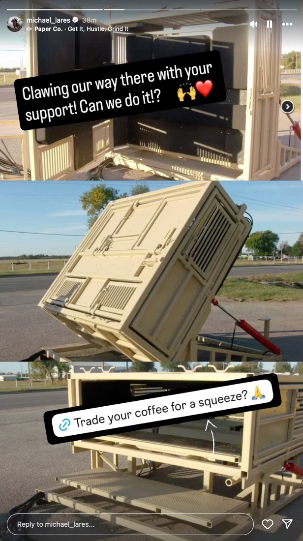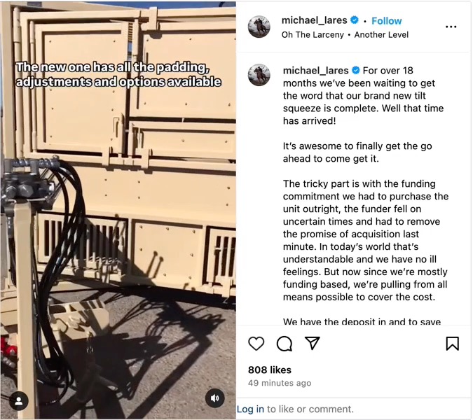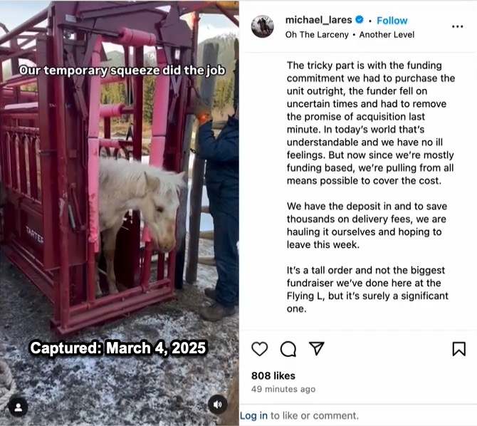 On March 4, 2025, Michael began campaigning on social media to raise US$53K in donations for Flying "L" Ranch to purchase a new "tilt squeeze" (more formally: a portable hydraulic horse chute). In the initial campaign post, he indicated he had placed the order and made a down-payment some 18 months earlier (approximately September 4, 2023). Based on the publicly available posts we reviewed, we have not located any public, itemized accounting (or other verifiable disclosure) showing the total donations generated through this campaign. However, from identifiable donation-related references in Michael’s posts, we were able to tally at least US$21,447 in donation amounts referenced in these posts (as of March 15, 2026). We also have not located any public photo, video, or other clear evidence showing the new tilt squeeze on the ranch or in use as of March 10, 2026. That is not proof it is not there (or will not arrive later), but it leaves an open, reasonable question: has the new unit been delivered (or scheduled for delivery), and if so, can Flying “L” Ranch provide a simple public confirmation (such as a delivery photo, an invoice excerpt with sensitive details redacted, or a brief accounting that ties the campaign proceeds to the purchase and remaining balance? In the March 4, 2025, fundraising campaign post, Michael said (transcript below): We've already removed and put up for sale our original squeeze to help offset costs. Yet as of mid-February 2026, Michael’s social media posts still show the original squeeze on the ranch, being worked on, and in periodic use (images below).
