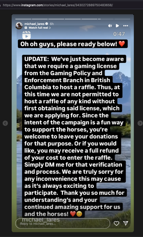 Michael has operated a number of raffles and lotteries where in return for monetary payments there's a chance to win prizes, such as a trip to the ranch. All of these raffles/lotteries were illegal because they were held without the required licenses which is a violation of British Columbia's Gambling and Fundraising regulations. Records disclosed in response to a Freedom of Information Request reveal detailed submissions by the public to the B.C. Gaming Policy and Enforcement Branch (GPEB) led to an investigation. The GPEB subsequently identified these raffles as illegal and ordered Michael and Flying "L" Ranch to cease and desist all such schemes. Here is the complete Freedom of Information Request #PSS-2024-42332 disclosure. The disclosure is 139 pages long and the summaries below may assist to understand the records disclosed therein. » Summary of Freedom of Information Request #PSS-2024-42332: The following request was made under the The British Columbia Freedom of Information and Protection of Privacy Act (the "Act") in respect to actions taken by British Columbia's Ministry of Public Safety and the Solicitor General, Gaming Policy and Enforcement Branch (GPEB), in respect to unlicensed gambling conducted on behalf of, or by, Flying "L" Ranch: Records regarding the number of complaints received by GPEB related to Flying 'L' Ranch and/or its representative(s) conducting unlicensed gambling/gaming activities on behalf of of Flying 'L' Ranch; correspondence between GPEB and Flying 'L' Ranch and/or its representative(s) with specific regard to the investigation of the complaints of unlicensed gambling/gaming activities including, but not limited to: correspondence of inquiry from GPEB to Flying 'L' Ranch and/or its representative(s) and response to same, warnings/directives from GPEB to Flying 'L' Ranch and/or its representative(s) and response to same; GPEB’s final results and conclusions (if any) as a result of its investigation into the unlicensed gambling/gaming activities of Flying 'L' Ranch and/or its representative(s). (Date Range for Record Search: From 1/1/2024 To 10/6/2024). Although the full disclosure is 139 pages the footer of each page shows the total number of pages to be 173. This is because some public records are available from the provincial government but at a fee and so were removed as part of the disclosure process. For example the BC Registries and OnLine Services is where the registration records for Flying "L" Ranch Ltd may be accessed, and the BC Land Title & Survey Authority (LTSA) is where the registration records for land may be accesses, all for a fee. In accordance with the Act additional redactions were made which have been itemized in the Summary of Redactions provided. » GPEB Incident Synopsis and Enforcement Actions: Included in the disclosure is the GPEB's documentation of Gaming Enforcement Actions. It begins with the Incident Synopsis which reads: Complaints were received regarding unlicensed raffles being conducted by the Flying L Ranch and specifically Michael LARES. The complainants detailed raffles being conducted that offered an opportunity to attend the guest ranch. Screenshots of raffle activity as well as PayPal information and other supporting information was provided. This is followed by the summary of Gaming Enforcement Actions. » Warning to Michael Lares & Flying "L" Ranch to Stop All Gambling Schemes: The records disclosed include a written warning letter directing Michael and the Flying "L" Ranch to immediately stop operating illegal online or other gambling schemes or risk prosecution (pp27-28): The Gaming Policy and Enforcement Branch (GPEB) has received complaints about raffle/ticket draws that you are running through your social media page. In each of these instances, you have been identified as the administrator of the group and/or the organizer of the game. These games and distinct types of draws are illegal in the Province of British Columbia and gambling in Canada is a regulated activity that must be licensed by the province in which it is conducted. It is important that you immediately stop any online gambling activities including bingo games, 50/50 draws, raffle/ticket prize draws, fundraisers with a draw or chance element, or any other gambling scheme and obtain the proper license(s) for any lottery scheme, bingo, or other game that you operate. The social media pages that you are operating these schemes from are being monitored and will be used in future prosecution should you not cease these activities immediately. » Concerns Raised by Complainants The disclosure Included: 1) An email GEPB received from a complainant (dated July 2, 2024) with the subject line "Want to find out if this raffle is legal - I suspect is in violation of gaming regulations" which began: I am concerned that Michael Lares of Flying "L" Ranch has recently conducted an raffle that was in violation of regulations and/or otherwise illegal (flyinglranch.ca). The complainant's email contained detailed descriptions, screenshots, and various links including links to the video of July 1, 2024 Williams Lake Stampede drawing of the ticket of the raffle winner (Susan Barnes). Of Michael's prolific social media posts we have been unable to find a single instance showing Susan Barnes as having received her prize of a trip to visit the ranch. 2) An email GEPB received from a complainant (dated August 2, 2024) expressing concerns about the lack of transparency in respect to donations: What concerns me is that there is no transparency or accountability whatsoever. The public never knows how the monies raised were are used, if in fact they were used for the intended purpose, or other purposes, or how much money was raised. In addition to what is documented below, Mr. Lares solicits donations by PayPal GoFundMe, Patreon, by appeals to eTransfer funds directly to him (via his personal email address), and also by appeals for donors to purchase gift cards at Beav
