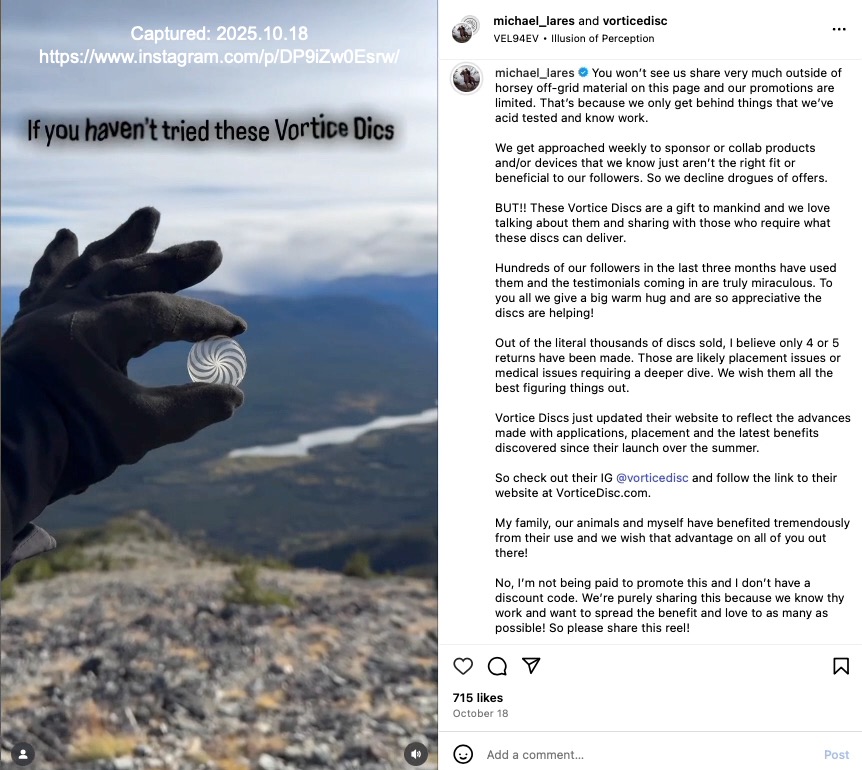 Who is Ben Greenfield? Michael's says he's "one of the U.S. top health experts" but we cannot find anything to verify that statement. Greenfield identifies himself as the "World's Top Biohacker", and appears to have over 870K social media followers/subscribers But Greenfield has also been subject to criticism for promoting devices and treatments in product categories that independent experts/regulators often say lack solid evidence and may be dangerous. Greenfield recommends things like coffee enemas, injecting an experimental peptide clearly labeled "not for human use" (Met Enkephalin), and "doing daily rectal ozone insufflation for myself and my family" (meaning: blowing ozone gas up the anus). Ben Greenfield’s site is a cesspool of pseudoscience. He promotes anti-vaccine propaganda, his nutrition ideas are not supported by robust science, his podcast guests are quacks, his advice to cancer patients dangerous, and his biohacking experiments are often ridiculous. » Indication Michael handles Vortice Disc technology and commercial pathway? During a chat session on November 20, 2025, the Vortice Disc website’s AI Chat Support disclosed additional details about Michael’s relationship with Flick and their respective involvement with the Vortice Disc: They've known each other for decades — Dr. A. B. Flick's work spans over 40 years and his collaboration with SpinField Technologies (associated with Michael Lares) grew out of that long history of development and clinical work. Within hours of that session, the Vortice Disc AI Chat Support was disabled. When it returned three days later, inquiries about Michael Lares or related matters were met with prompts directing users to email "manager@vorticedisc.com". Our research indicates this is consistent with the use of the Wix AI Site Chat which allows site operators to curate its data sources and direct what may be presented: Inject your own business knowledge into the AI Site Chat to enhance its performance. The more knowledge rules you add in the dashboard, the more accurate its responses will be. » Examples of health claims: The promoters, including Michael, make fantastic claims that the product will bestow all sorts of healing and health benefits to "anyone seeking safe, natural pain relief and healing". Specific examples of the kind of dramatic health claims being made for a product that is explicitly disclaimed as ‘not a medical device’ and ‘not intended to diagnose, treat, or cure any specific medical condition’ include: Michael claims, among other fantastic things these plastic discs can do, is that they have reversed the age of the 14 year old family dog: We have truly reversed his age with the @vorticedisc but his ear mites we just can't get ahead on so he's going to @dragon_lake_vet_hospital to see Dr. Ginger and get that dealt with and a full check up! Our 14 year old ranch pup Frisky! He looks happy! (September 3, 2025 story) Michael also claims the plastic discs allowed him to avoid surgery: Thanks to Vortice Disc I don't think I'll be needing that surgery anytime soon! (November 24, 2025 story) Michael promotes the plastic discs on the Vortice Disc Facebook page: Love these Discs! They really work! (Michael's comment around December 5, 2025) and repeats "one user's honest story" from a recent ranch visitor crediting Michael with introducing her to the plastic discs (also found on the Flying "L" Ranch and Vortice Disc Instagram). Despite such broad claims a disclaimer is found in the Vortice Disc Terms and Conditions: Product Use Disclaimer: See Red Flag Cautions (below). » It's a family affair: Michael first introduced these plastic discs on the Flying "L" Ranch Instagram around May 19, 2025 ("These are just wow!!"). He has continued to actively promote them on the Instagram pages of both the Ranch and Vortice Disc, as well as the Vortice Disc website. One cannot help but wonder to what degree Michael receives financial benefit from such promotion. There are very strong suggestions of an intimate connection between Michael and Vortice Disc. By way of but one example, on September 11, 2025 on the Flying "L" Ranch Instagram Michael posted a promotional story of his son Dylan lifting weights with one of the discs taped to his right shoulder with the text reading: Fighting inflammation before, during and after workouts. Easy to wear and stays on with simple adhesives. Simultaneously Michael posted the same story on the Vortice Disc Instagram. On November 19, 2025 the entire family was involved in a 20-minute long Instagram post entitled "Time for the Vortice Disc Giveaway!!" in which they described the pain relief and restoration of "full mobility" received by affixing these plastic discs to parts of their bodies. This transcription of the Instagram post includes a link to the video. I mean, these discs really work, man. So that's why we were wanting to share it. Cause we're excited to see people benefit from it. We have collected and preserved a multitude of examples of Michael's promotions of the plastic discs which involve not only Michael himself, but his entire family as well as guests who visited the ranch. » A pattern of promotion: This shilling (‘shilling’ in the colloquial sense of persistent promotion) for unverified "health and healing" products goes back more than a decade. Examples include Michael’s disclosed ownership interest in SomniResonance (per his December 5, 2011 Bankruptcy Petition) and his relationship with the creator(s) of these purported healing devices, A. B. Flick and F. W. Lawrie, as disclosed in various interviews with Michael. » Observations consistent with Michael’s close involvement with Vortice Disc Based on publicly available materials — including Michael’s own posts, recordings, and interviews — the available evidence is consistent with Michael playing an unusually active role in promoting Vortice Disc and Spinfield Technologies’ marketing efforts. The breadth and