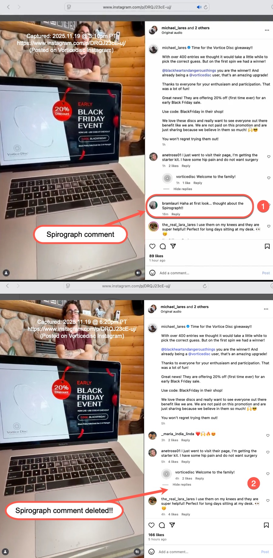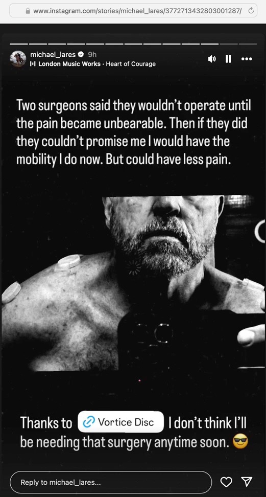 Here is a gallery of screen captures of Michael's social medial postings promoting the Vortice Disc (from May 19, 2025 to date). The company responsible for the plastic discs is Spinfield Technologies Inc., incorporated by Arthur B. Flick. In a podcast interview with Ben Greenfield Michael (March 23, 2016) Michael spoke of his decades–long relationship with Flick. In the interview Michael and Greenfield collaboratively promoted a device marketed by Michael and Flick (the SomniResonance SR1 Delta Sleeper) with Greenfield offered an affiliate-type 10% discount code ("Greenfit10"). In a later podcast interview with Greg Zuffelato (Feb 22, 2017), Michael again ties the SR1 pitch to his long-standing relationship with Flick, while describing himself as an “angel investor” and board member. He layers regulatory-sounding reassurance that may be read as implying FDA endorsement, but the interview does not provide evidence of FDA approval, supporting documents, or third-party verification. He leans on authoritative medical and technical language (e.g., “brain” sleep frequencies, “nudging” sleep stages, “resetting” circadian rhythm, and gauss comparisons) while advancing broad efficacy and safety claims, including medication-adjacent “step-off” comments, without the interview providing supporting evidence, references, or independent validation a reader can check. He offers a 5% discount to those who email him at Delta Sleeper. Around the same period a November 24, 2016 WHOOP feature likewise describes Lares as proprietor of an “FDA–approved” sleep aid and summarizes SR1 as using pulsing electromagnetic signals to help induce sleep, again utilizing regulatory-sounding language presented without supporting documentation or independent verification in the article.