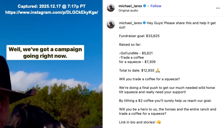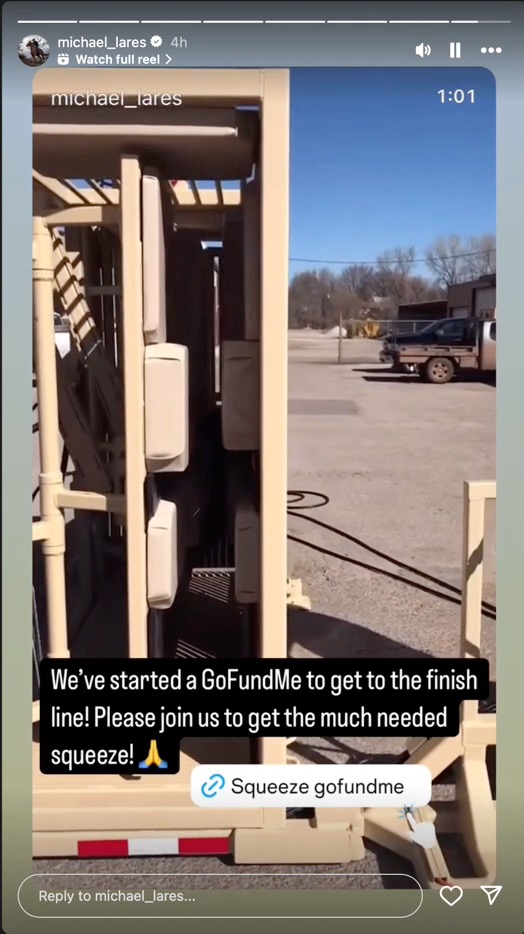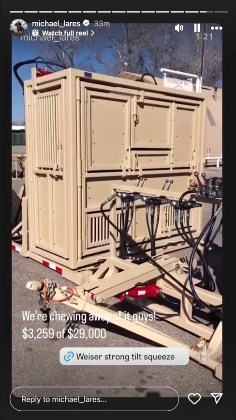 On March 4, 2025, Michael began campaigning on social media to raise US$53K in donations for Flying "L" Ranch to purchase a new "tilt squeeze" (more formally: a portable hydraulic horse chute). In the initial campaign post, he indicated he had placed the order and made a down-payment some 18 months earlier (approximately September 4, 2023). Based on the publicly available posts we reviewed, we have not located any public, itemized accounting (or other verifiable disclosure) showing the total donations generated through this campaign. However, from identifiable donation-related references in Michael’s posts, we were able to tally at least US$21,447 in donation amounts referenced in these posts (as of March 15, 2026). We also have not located any public photo, video, or other clear evidence showing the new tilt squeeze on the ranch or in use as of March 10, 2026. That is not proof it is not there (or will not arrive later), but it leaves an open, reasonable question: has the new unit been delivered (or scheduled for delivery), and if so, can Flying “L” Ranch provide a simple public confirmation (such as a delivery photo, an invoice excerpt with sensitive details redacted, or a brief accounting that ties the campaign proceeds to the purchase and remaining balance? In the March 4, 2025, fundraising campaign post, Michael said (transcript below): We've already removed and put up for sale our original squeeze to help offset costs. Yet as of mid-February 2026, Michael’s social media posts still show the original squeeze on the ranch, being worked on, and in periodic use (images below).